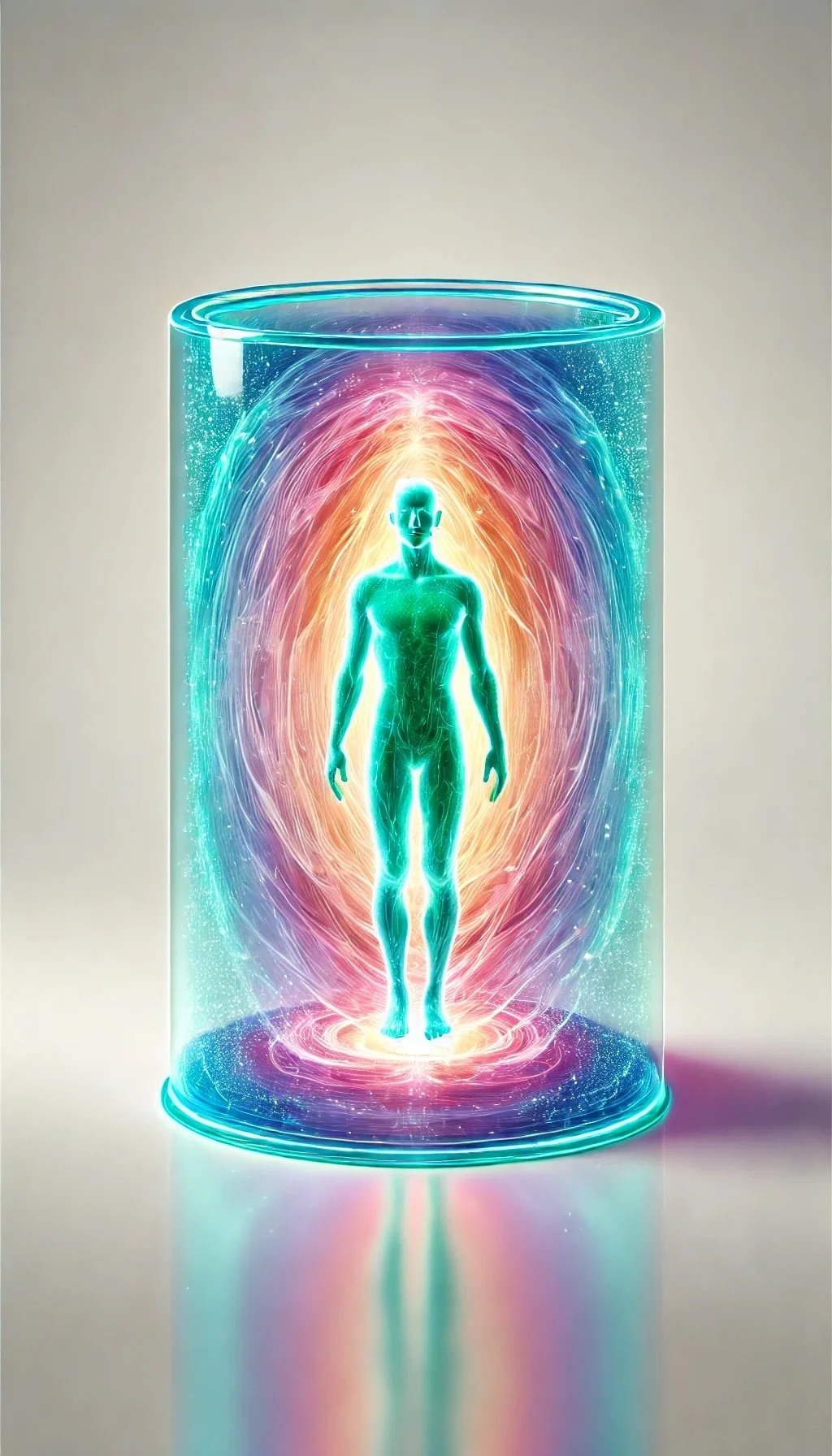Nachdem du deinen Körper einige Male langsam von oben nach unten und wieder zurück durchgescanned hast, beschleunige den Ring so schnell, dass er einen vollständig geschlossenen Zylinder darstellt. War der Ring in deiner Vorstellung eher kleiner und eng am Körper anliegend, erweitere diesen eng anliegenden Zylinder auf einen Durchmesser von etwa einem Meter.
